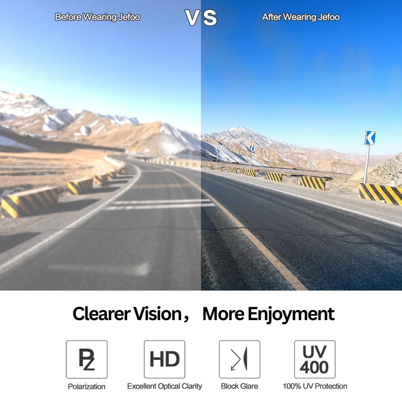 - POLARIZED & UV400 PROTECTION: Engineered with 1mm TAC multi-layered film lenses, Jefoo shades effectively eliminate glare from water, roads, and reflective surfaces, delivering true HD clarity. Full 100% UVA/UVB protection shields eyes during daily wear and travel adventures