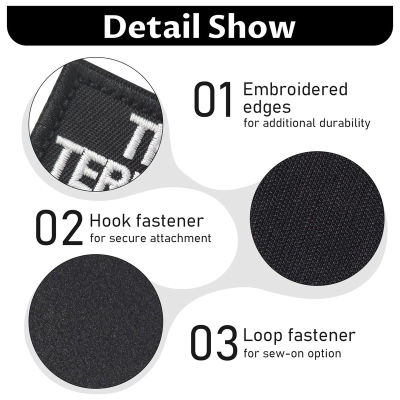 • High quality embroidery stitching with tearable hook and loop fastener technology, durable, removable and washable.