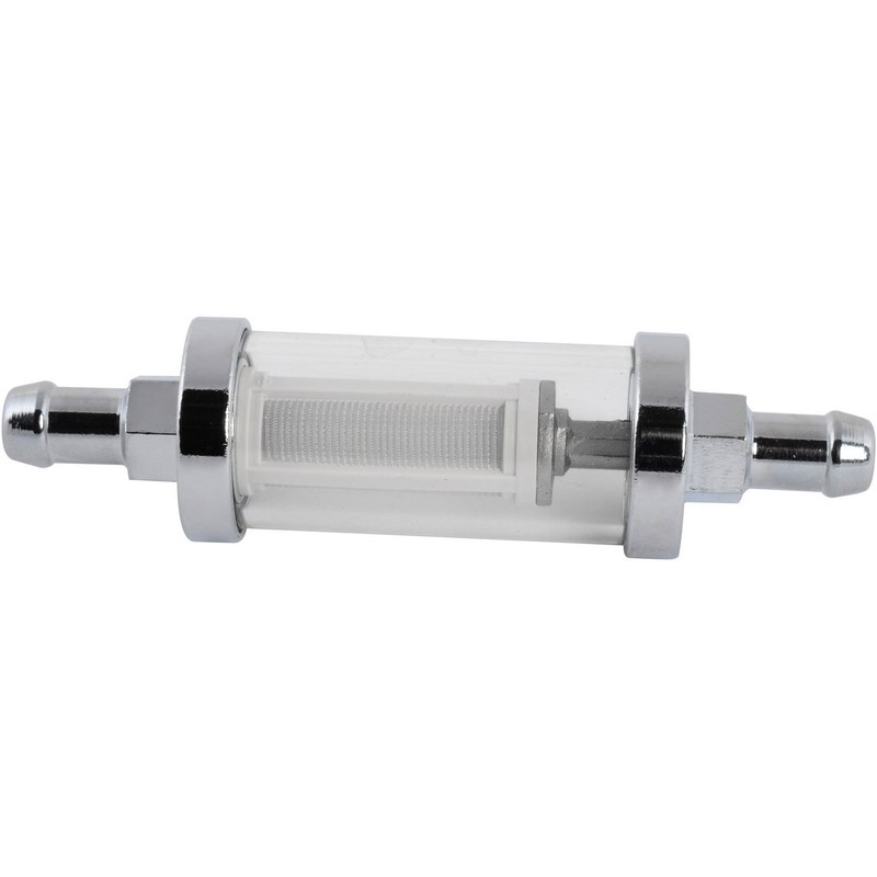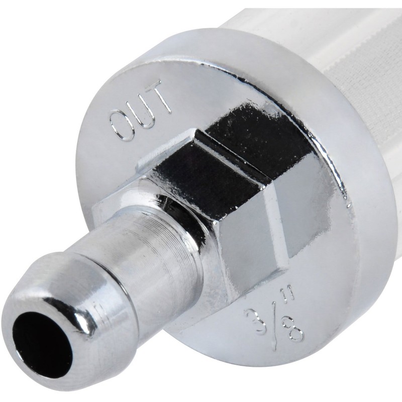 * 3/8 in. Male/Male * Length: 2 5/16 in. * Diameter: 0.975 in. * Smallest Particle Filtered: 80 Microns * Chrome Plated Steel Hose Barbed Ends