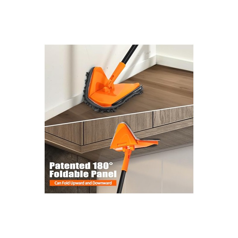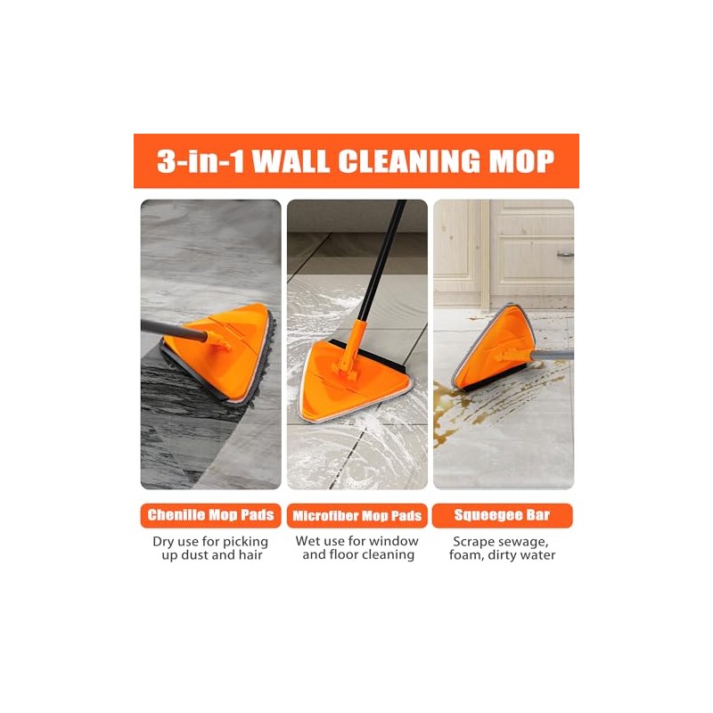 JEHONN JEHONN Wall Mop with Long Handle 80 inches, Upgraded 180 Collapsible Baseboard Cleaner Tool with Squeegee, Ceiling Duster with 3 Microfiber and 3 Chenille Pads for Cleaning Window, Cabinet (Orange)