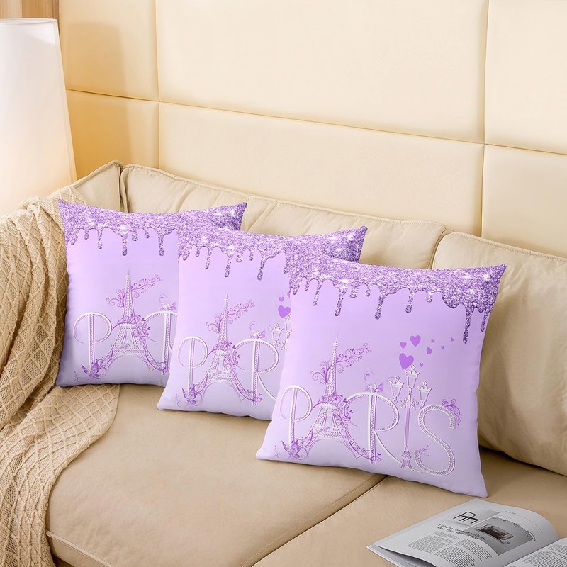jejeloiu Eiffel Tower Throw Pillow Covers, Glitter Purple Cushion Case for Home Living Room Decor, Reversible Chic Paris Theme Decorative Throw Cushion Case, 18"x18" Set of 2 Soft