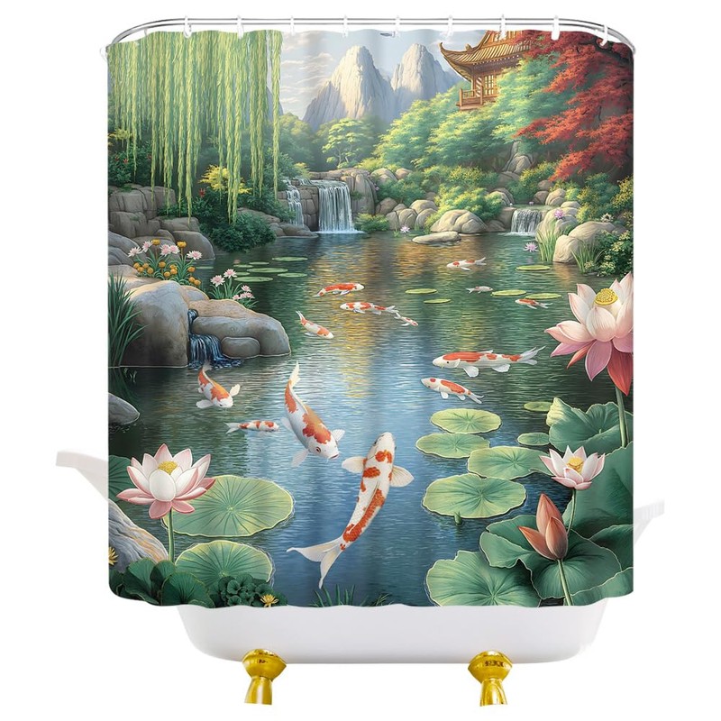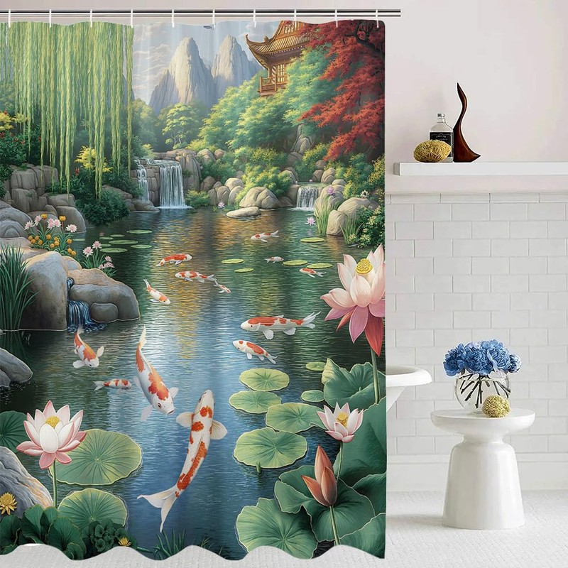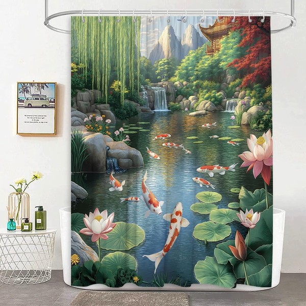 JEJOMEAG Japanese Garden Shower Curtain Lotus Flowers Green Leaves Red Fish Park Waterfall Spring Summer Nature Scenery Fabric Bathroom Decor Curtain with Hooks, 70Wx70H