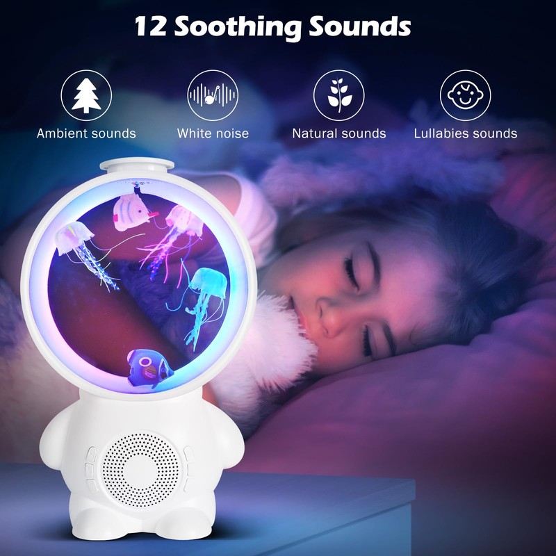 - 🪼【10 Light Modes + 14 Built-In White Noise】: Short press to adjust 10 different light mode options: white, pink, blue, sunset, seven-color gradient, cycle gradient, marquee, and music rhythm. Our children's night light jellyfish lamp also has 14 kinds of white noise built-in, which can emit relaxing music when children use it. Astronaut jellyfish lamp is for all kids because this gift is so cool!