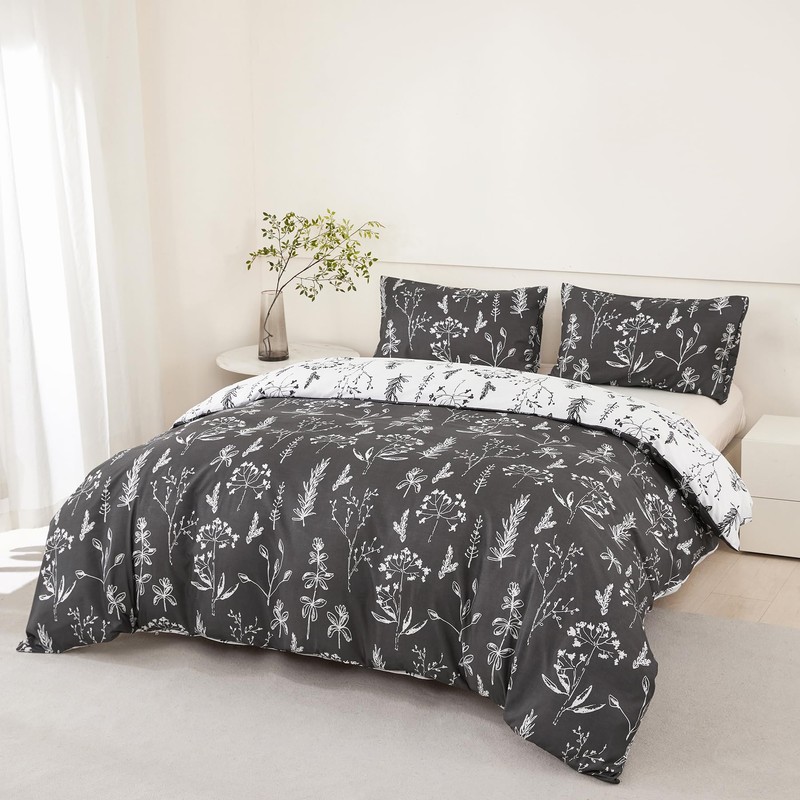 Jemiipee Bed Linen 135 x 200 cm White Anthracite Bed Linen Set with Floral Pattern Duvet Cover 135 x 200 cm Pillowcase 80 x 80 cm Duvet Cover Reversible Bed Linen Soft with Zip