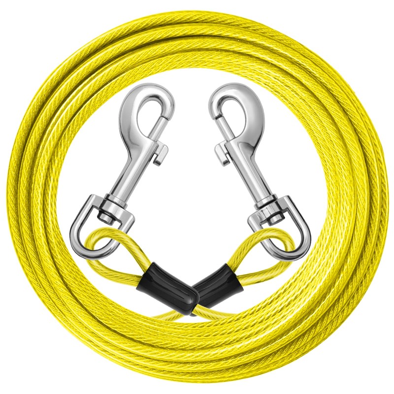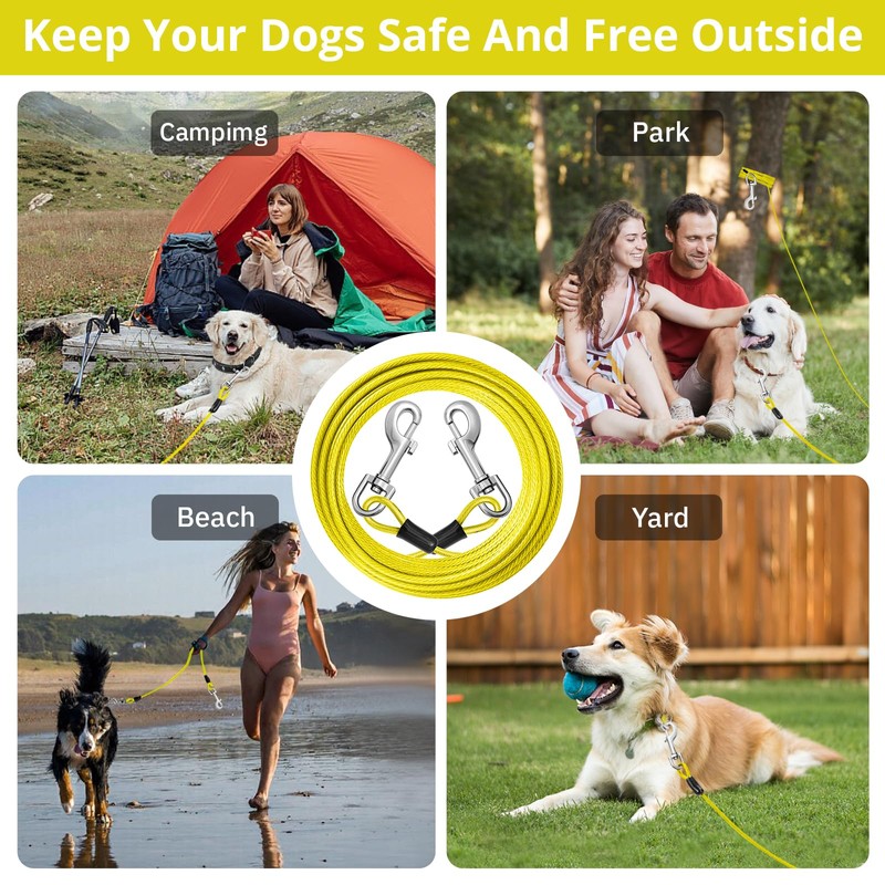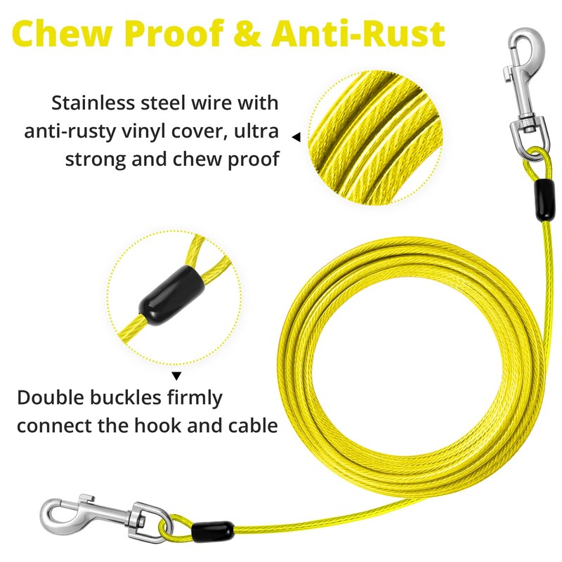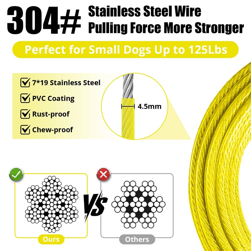 - Heavy Duty and Ultra-Strong Steel Cable: Crafted with 5mm high-strength stainless steel wire and reinforced PVC coating, this dog tie out cable withstands up to 1700 lbs break strength and is chew-proof, engineered for dogs up to 125 lbs to ensure ultimate safety in yards, camps, or gardens.