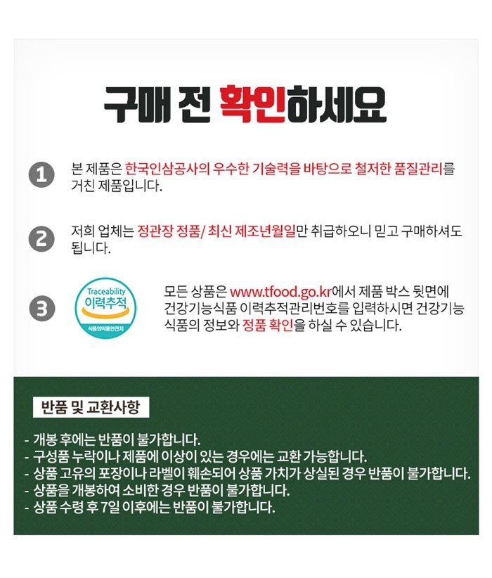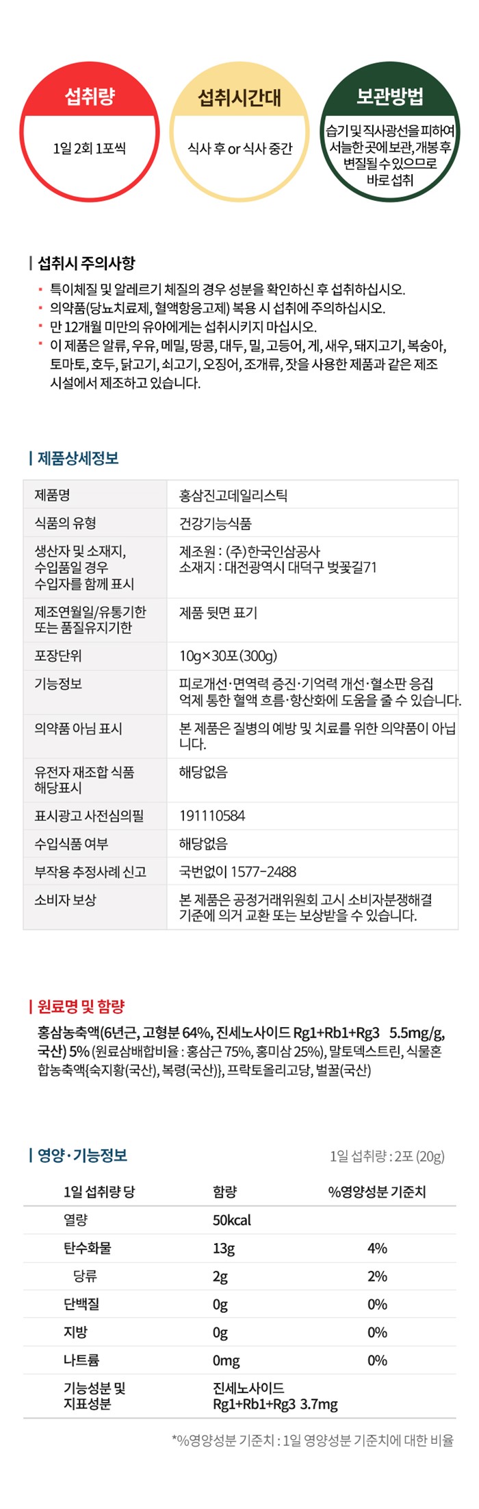 주요 성분 : 홍삼농축액 5% (6년근,고형분 64%, 진세노사이드 5.5mg/g) 용량 : 10g x 30포 x 2박스 섭취법 : 1일 2포 제조원 : (주)한국인삼공사 유통기한 : 1년 이상 상품
