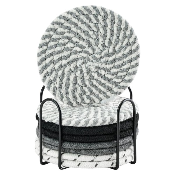 JEPELUS 8PCS Cotton Coasters for Coffee Table with Holder, Boho Coasters for Drinks, Fabric Drink Coasters Absorbent Office Desk, Round Cotton Woven Coasters for Car Home - 4.3inch, Black Grey Series