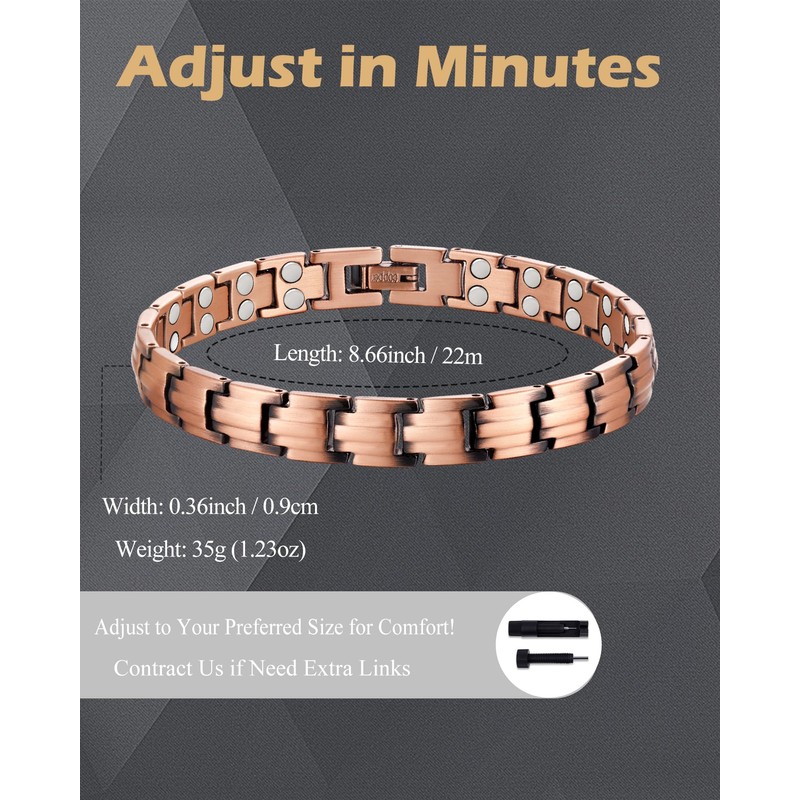 - Verstellbares Armband: Länge: 21,5 cm; Breite: 0,7 cm; Gewicht: 24 g. Dieses Kupferarmband wird mit einem Entfernungswerkzeug geliefert, um die Größe des Magnetarmbandes anzupassen, und eine Anleitung zur Anpassung (evtl. nicht in deutscher Sprache). Sie können das Armband einfach zu Hause anpassen.