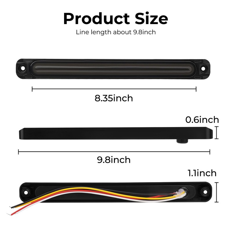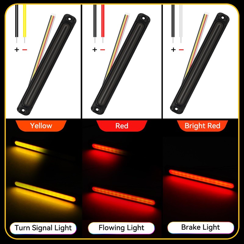 • Multi-functional LED Light Bar: A set of 2, 10 "ultra-thin LED vehicle light strips, suitable for brake lights, turn signals, signal lights, reverse lights, taillights, sign lights, gap lights, identification lights, etc. Three-in-one: Red brake lights, Amber sequential flow turn signals and Red sequential flow running lights.