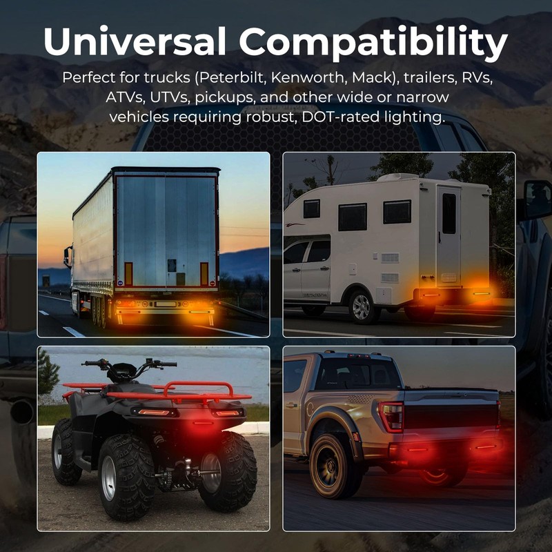 • Application: Widely used in trucks, trailers, heavy trucks (Peterbilt cargo ships, Kenworth Mack Western Star), semi-trailers, cargo trailers, ship trailers, off-road vehicles, ATVs, UTVs, RVS, pickup trucks, work vehicles and wide or narrow land vehicles that require high-quality DOT-rated lighting.