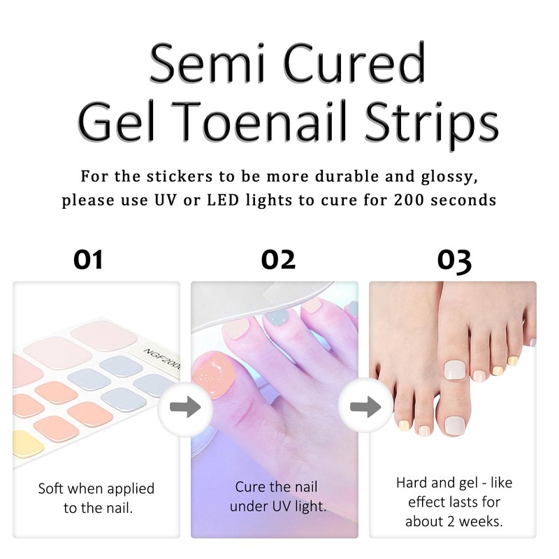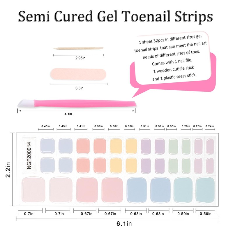 - Package Contents - You will receive 1 sheet semi cured gel toenail strips. Each sheet includes 16 sizes, 2 pieces per size, 32 pieces in total, can meet the nail art needs of different sizes. Come with 1 nail file,1 wooden cuticle stick and 1 plastic press stick.