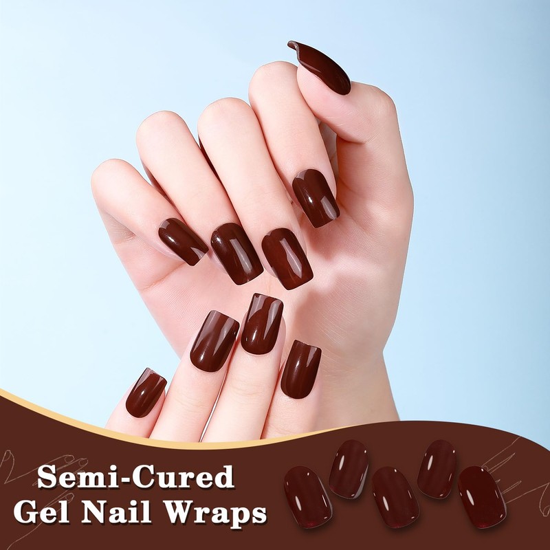 JERCLITY 2 Sheets 32pcs Semi Cured Gel Nail Strips, Gel Nail Wraps Needed LED Lamp to Cured, Ease to Use and Removal, 2 Prep Pads,1 Nail File,1 Wooden Cuticle Stick(Chocolate Color+Cherry Red)