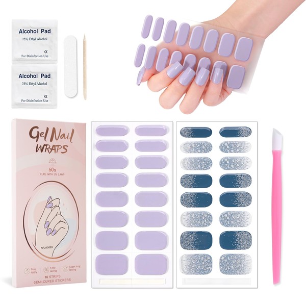 JERCLITY 2 Sheets 32pcs Semi Cured Gel Nail Strips, Gel Nail Wraps Needed LED Lamp to Cured, Ease to Use and Removal, 2 Prep Pads,1 Nail File,1 Wooden Cuticle Stick(Lavender Purple+Winter Ice Snow)