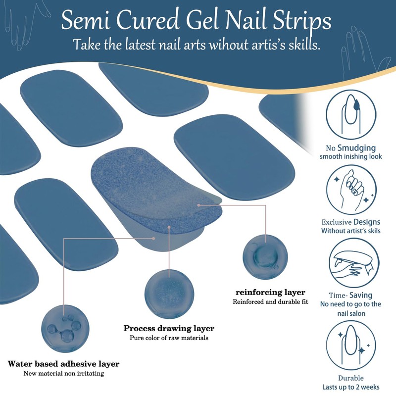 • Package Contents - You will receive 2 sheets semi cured gel nail strips. Each sheet includes 8 sizes, 2 pieces per size, 32 pieces in total, can meet the nail art needs of different sizes. Also 2 prep pads,1 nail file,1 wooden cuticle stick.