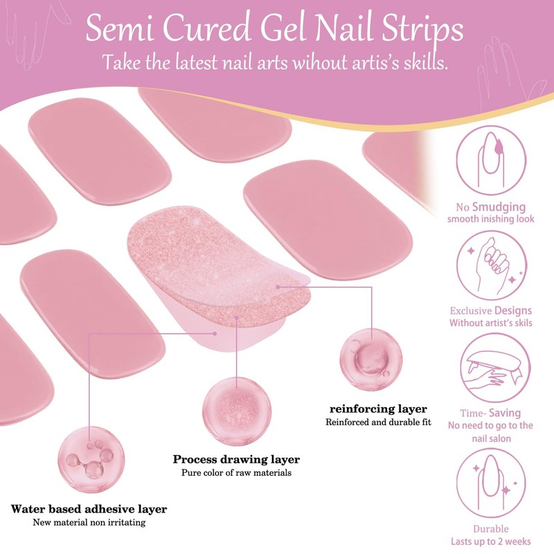 • UV Semi-Cured Technology - Our gel wraps are made from a unique, light-sensitive UV gel that is semi-cured for optimal flexibility during application. This means they effortlessly conform to the curves of your nails, providing a seamless and professional look that lasts.
