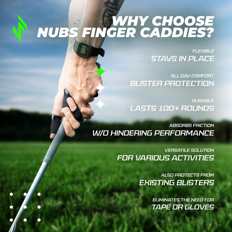 • USE ON THUMBS AND FINGERS - NUBs can be used on any finger or thumb to cover those frequent problem areas; These golf finger protection Caddies are easy to slip on and stay on for an entire day; Get rid of sticky golf thumb tape that comes off mid-round