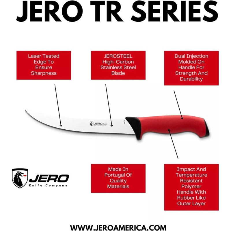 The Pro Series TR, or TR Series by JERO represents years of research, development and testing to design and produce a quality knife that was comfortable to use, while providing control and blade durability. The handle design allows for a comfortable grip at various hand locations, so whether you hold the knife traditionaly; hold it towards the front of the handle over the spine, or hold it backwards with the thumb on the end of the handle, the TR handle will fit your handle securely allowing for better control and safe operations. The handle features a double, or dual injection molded on process. The handle is built around the blade and tang to form a seamless, and strong bond between the blade and handle. The first layer is constructed of name brand commercial grade polymers that form a hard and dense structure that hardens on the blade and tang. The next layer is constructed of a rubber like polymer that is injected under pressure around the first layer, forming a seamless bond between the two layers. Unlike other brands of soft grip knives, our process of pressure injection of the second layer greatly reduces peeling of the soft grip polymer - it is a more expensive process of soft grip manufacturing, but one we believe is necessary to produce the highest quality soft grip handle. Handle polymers are impact and temperature resistant. Blades are constructed of high-carbon stainless steel, with most of the steel coming from European manufacturers such as Germany. Our steel is the same, or very similar steel used by all the major European, high end and professional grade knife brands, especially those out of Germany and Switzerland, except by having lower labor and operating costs in Portugal, we can provide that same high quality level at a lower price point. JERO knives are used around the world by commercial meat and food processing establishments, as well as professionals in the food service, grocery, fishing and agriculture industries. The TR Series is a workhorse of a line with many different blade styles to meet our customers' needs.