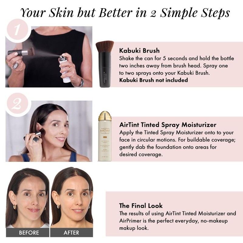 - Effortless Beauty: Achieve an effortless "no-makeup, makeup" look with our AirTint Tinted AirBrush Spray Moisturizer. This skin tint face spray sets seamlessly over your skin. Whether you're getting ready for a special occasion or simply want to add a touch of elegance to your everyday look, you'll love the dewy and weightless coverage of this multi-tasking formula!
