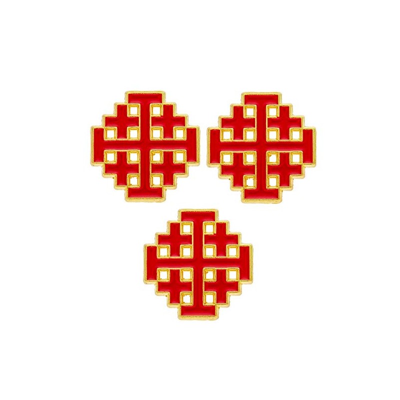 Family Pack of 3 Gold and red enamel Jerusalem lapel pins. Quality Christian 3 Cross lapel pin with many crosses is 3/4 Inches square with piecing. Very popular. The five-fold cross is symbol of the Five Wounds of Christ, Christ and the four quarters of the world or Christ and the four evangelists. Discipleship. Wear as a family. Clutch back. The Rite of Christian Initiation of Adults (RCIA). Lead-free pewter.