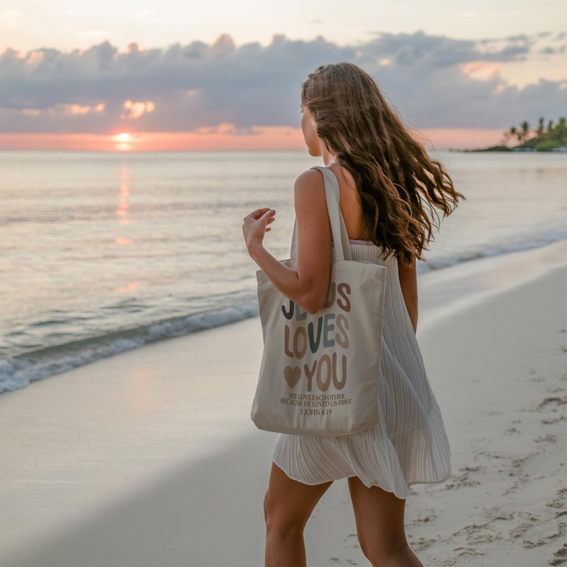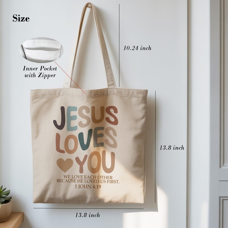 - Faith-Inspired Christian Design: This tote bag showcases a heartfelt “Jesus Loves You” message with a beautiful scripture from 1 John 4:19, making it a meaningful gift for Christians seeking to express their faith and share love.