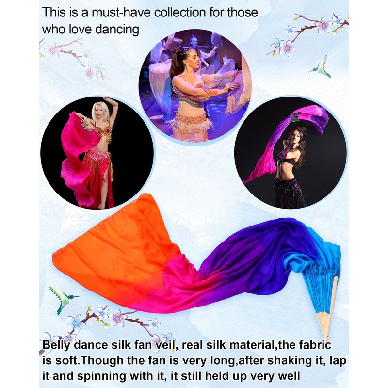 - Product materials: the hand-made belly dance silk fan veil is made of real silk material, which is soft, and the fan has a gradient of colors, very showy when it is waved; The fan bone is made of polished thick bamboo, with quality and flexible switch;Meanwhile, bamboo staves are wider, thicker than most other fans, curves on every wide, comfortable to hold