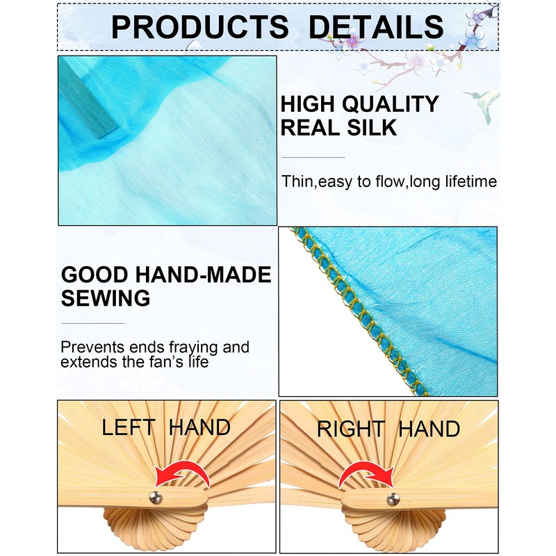 - Pretty design: with three-line machine seaming, the seamed edge of the bamboo long fan veil is exquisite, totally handmade, and the necessary edges are stitched to prevent fraying; Though the fan is very long, after shaking, lapping and rotating it, it still can be held up very well, really a must-have collection for those who love dancing
