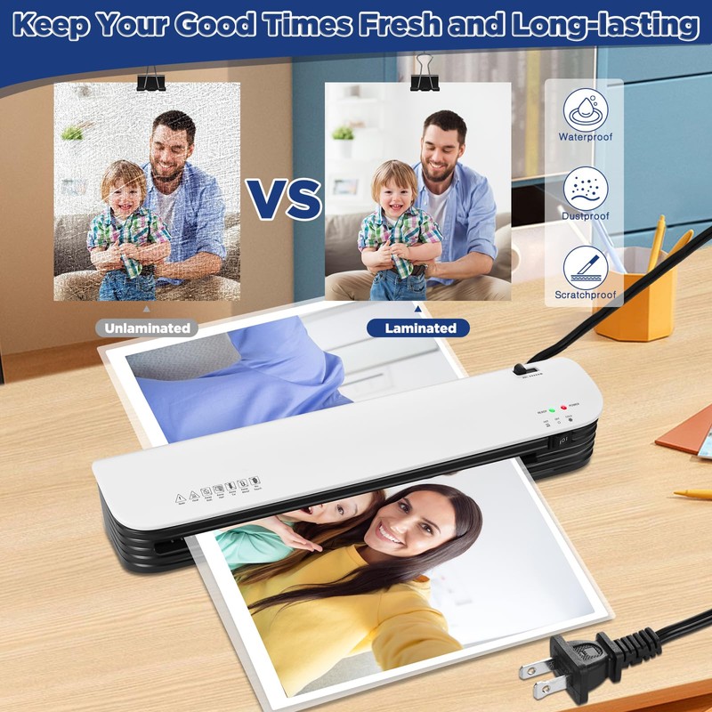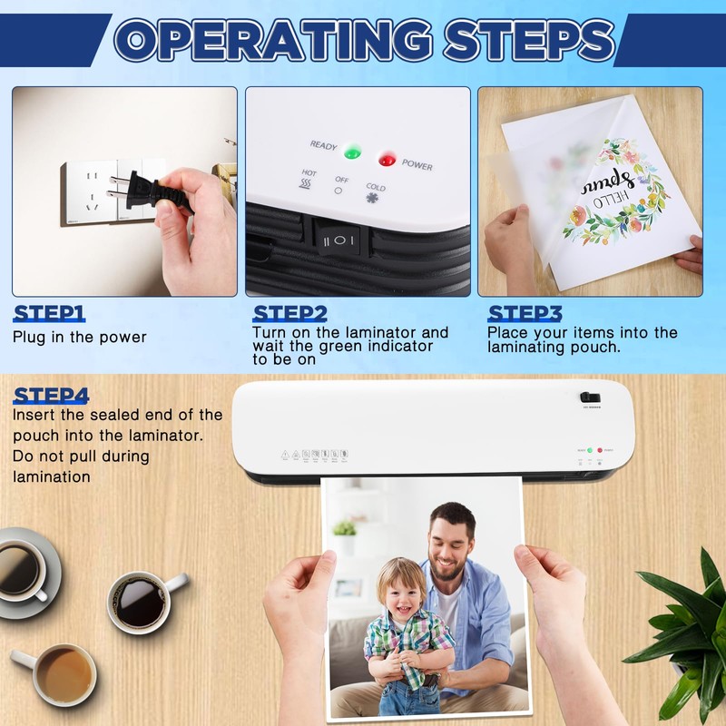 • Safety Features: safety is our priority; Our laminator machine is outfitted with an ABS button to avoid paper jams; Simply press the ABS button to remove the jammed film easily and safely with one hand, ensuring the protection of your files and the machine; Say goodbye to frustration, and welcome to effortless lamination