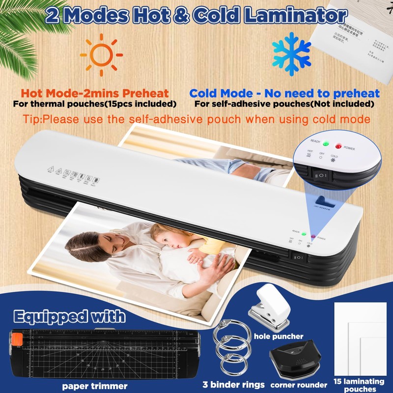 • Complete Set for Enhanced Versatility: this lamination kit includes an A3 laminating machine, 1 paper trimmer, 1 corner rounder, 15 laminating pouches, 3 binder rings, 1 hole puncher and 1 user manual; Our laminator is suitable for home, office, and school use, revered for preserving significant documents and treasured photos