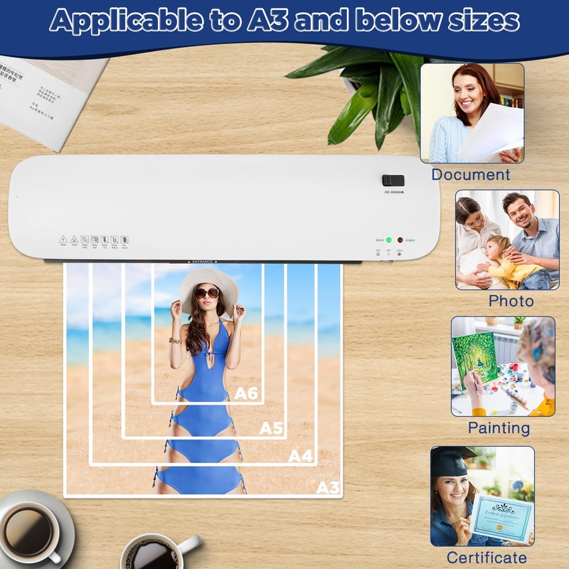 • Versatile Paper Size Compatibility: featuring compatibility with the A3/ A4/ A5/ A6 size papers and photos, it easily accommodates standard sizes like letter size and business cards; Our laminator A3 can help you to keep your important documents from water, dirt, fading, scratches, or tears, and it works quietly, producing noise levels below 30 decibels, creating a peaceful work environment, suitable for home, classroom, office, and professional environments
