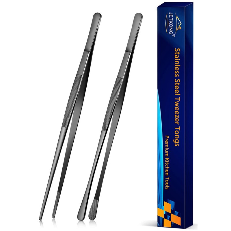 JETKONG 2 Pcs 10-Inch Kitchen Tweezers Tongs with Precision Serrated Tips, Stainless Steel Chef Tweezer Professional Cooking Tweezers for BBQ, Plating and Serving (10-Inch, Black)