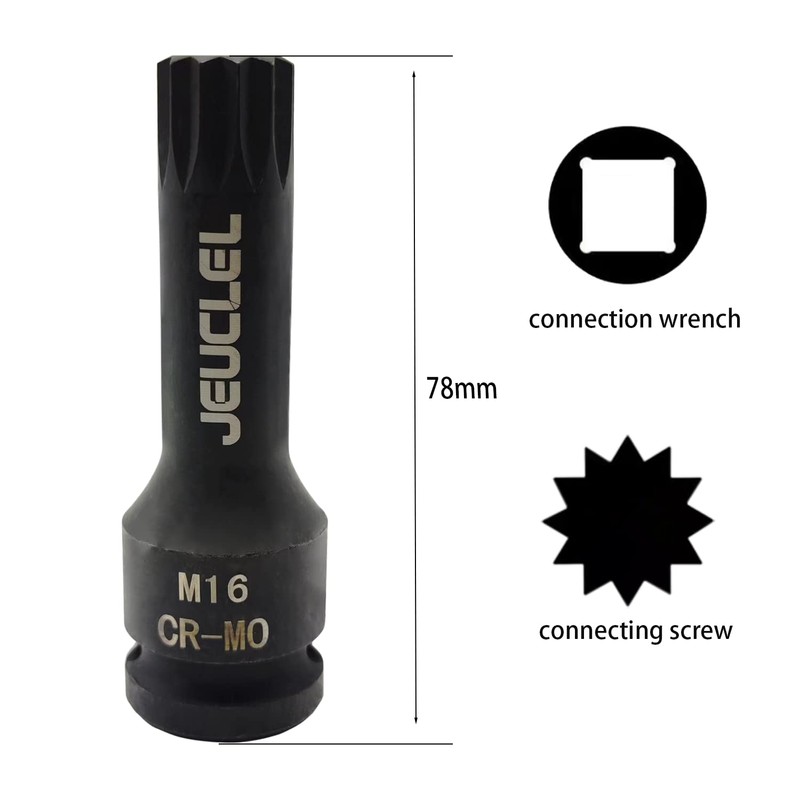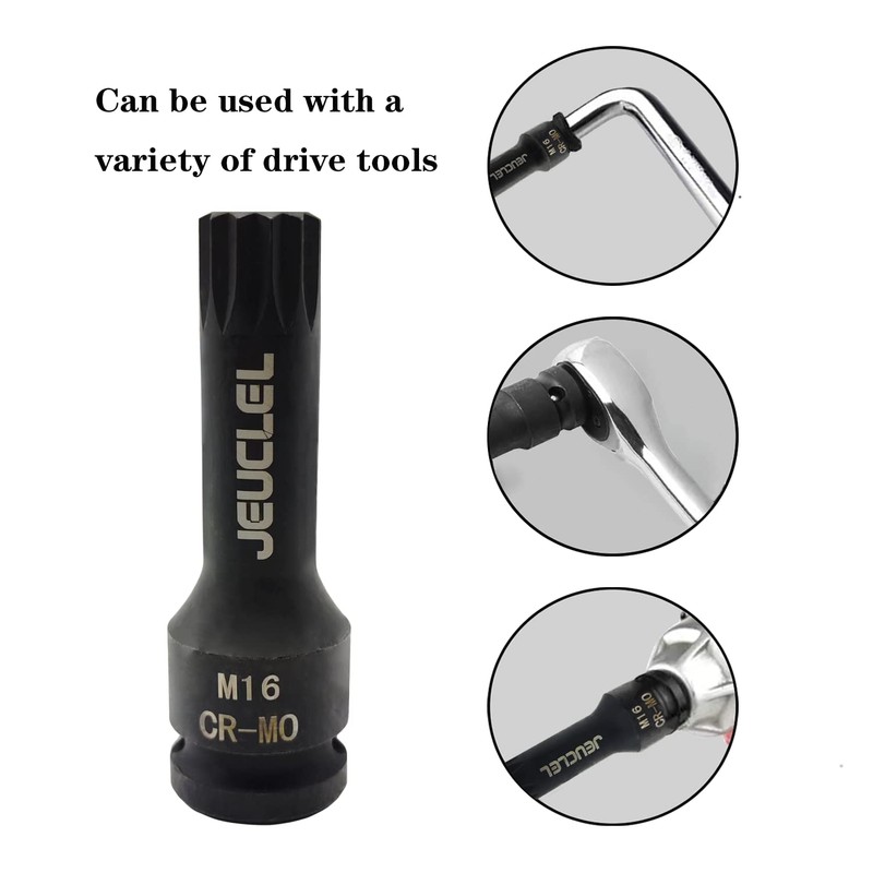 - 【Specification】 1/2-Inch Impact Drive Socket, M16 (16mm) spline bit, 3.07-inch (716mm) total length. The lengthened design makes it suitable for more work scenarios.