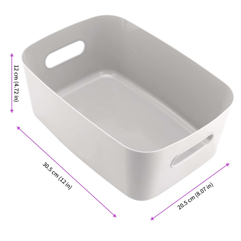 - CARRYING HANDLE DESIGN - Each plastic storage basket is designed with cut-out handles on both sides, a small handle that helps you to lift and carry them. The handles also help to slide the baskets when they are stored on a shelf or in a cupboard.