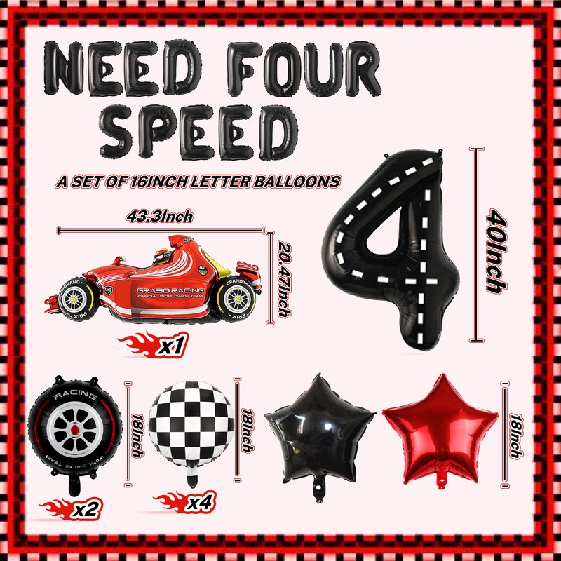 - You will get: 16 inch Need Four Speed Letter Balloons,1 x 40 inch number balloon”4”, 4 x foil balloons, 2 x star foil balloons,2 x wheels balloons, 1 x racing car balloon