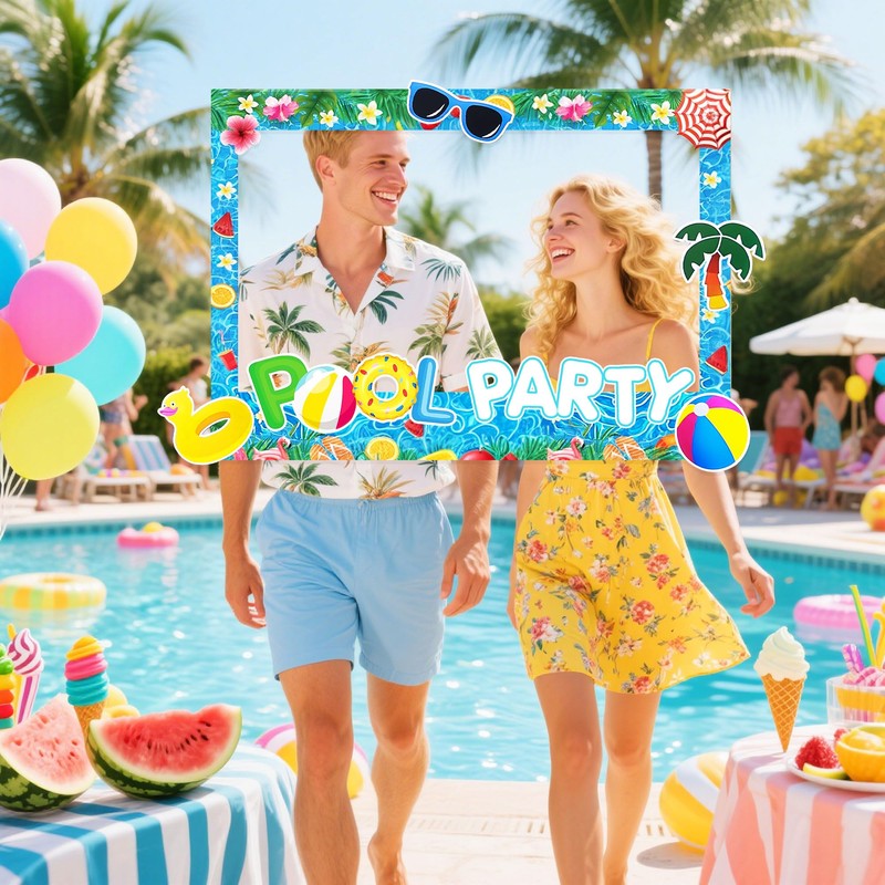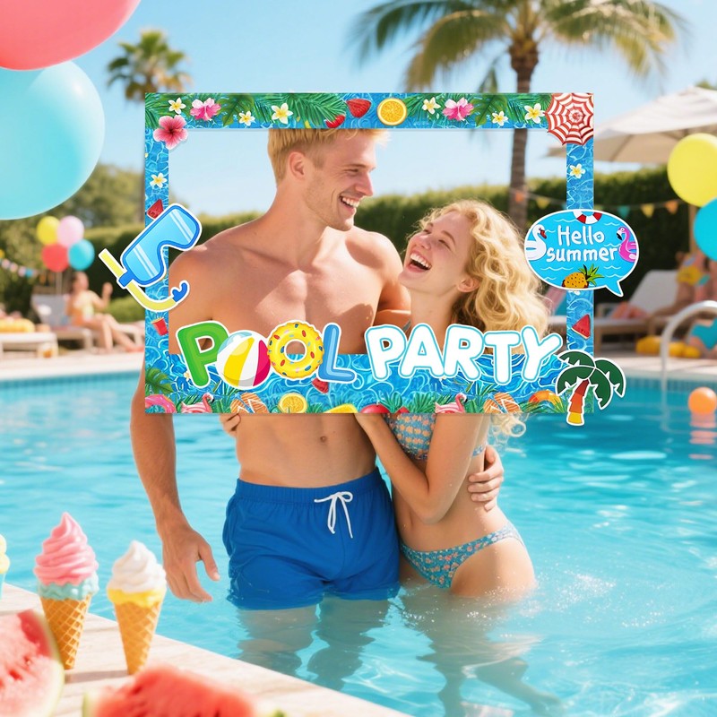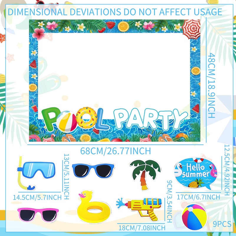 - You will get: 1x “POOL PARTY” photo frame, 8x pool photo booth props