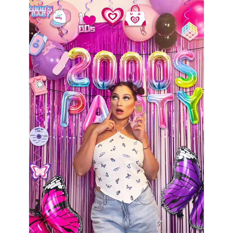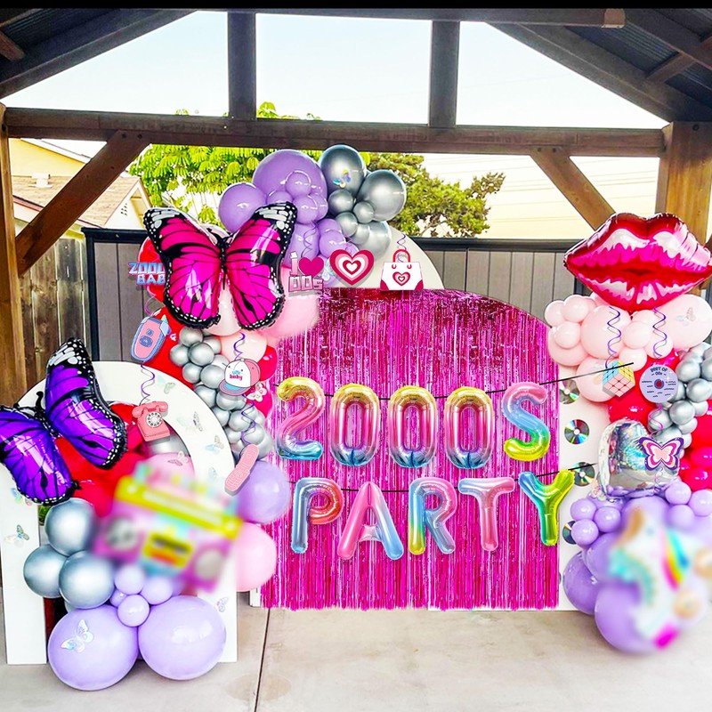 - You will get: 1 x foil fringe, 5 x pink balloons, 5 x red balloons, 5 x purple balloons, 2 x butterfly balloons, 1 x “2000S BABY” balloon, several spiral decor. Size as picture shows