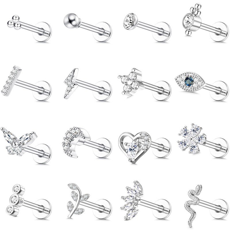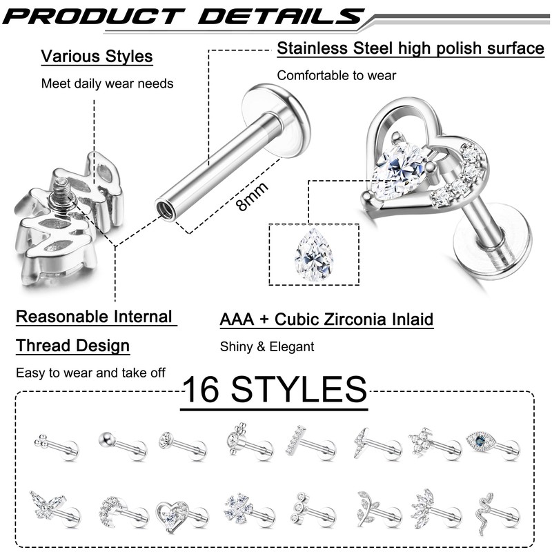 JeweBella Pack of 16 16G Helix Tragus Piercing Cartilage Earrings for Women Surgical Steel Internal Thread CZ Moon Heart Leaf Monroe Medusa Labret Piercing Nose Stud Lip Piercing Helix Piercing Ear,