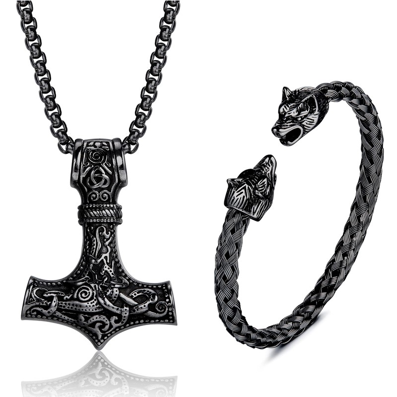 - Men's Viking jewellery set: one order includes a Viking men's necklace and a wolf head bracelet. Inspired by Norse mythology, Thor's hammer necklace symbolises courage and is considered a talisman by the Vikings. The wolf head bracelet represents a dominant man, a huge and emerging masculinity!