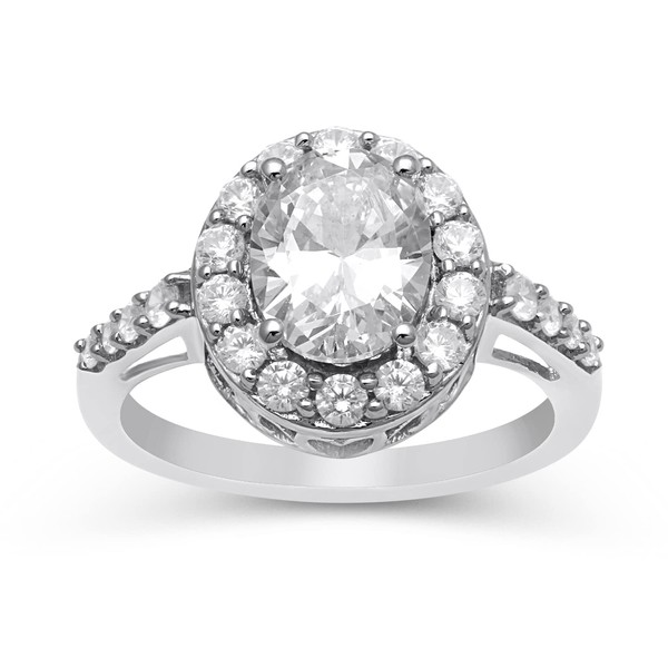 Jewelili Sterling Silver 9x7MM Oval and Round Created White Sapphire Ring, Size 7