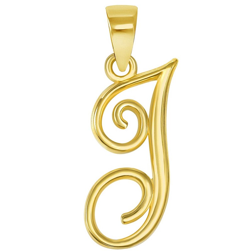 - This personalized elegant solid gold 14 karat gold capital letter J charm pendant cursive handwriting script font is a perfect fit for necklaces and bracelets