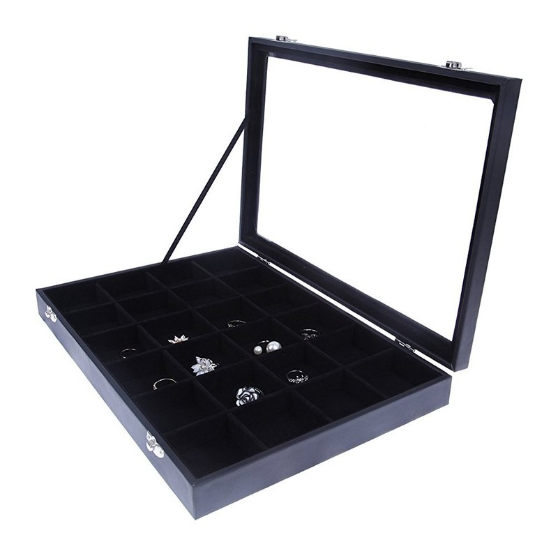 - VELVET JEWELRY DISPLAY: A black velvet ring and earring organizer featuring 24 spacious compartments and metal clasp closures