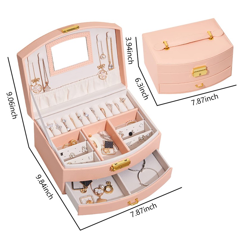 Jewelry Organizer Box 2 Layers Jewelry Case, PU Display Case with Mirror&Ring Tray, Rings Earring Necklace Bracelet Display and Storage Case for Women Girl Pink