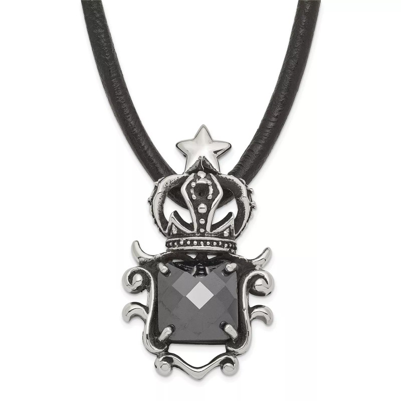 Jewelry Stores Network Stainless Steel Antiqued Crown Black Glass Necklace