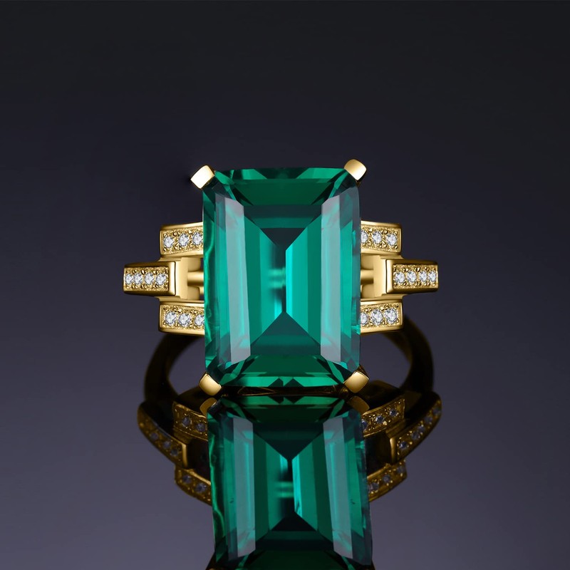 JewelryPalace Emerald Cut 6ct Simulated Emerald Solitaire Cocktail Rings for Women, Green Gemstone 925 Sterling Silver 14k Yellow Gold Plated Ring, Gemstone Ring for Girls Jewellery Set T