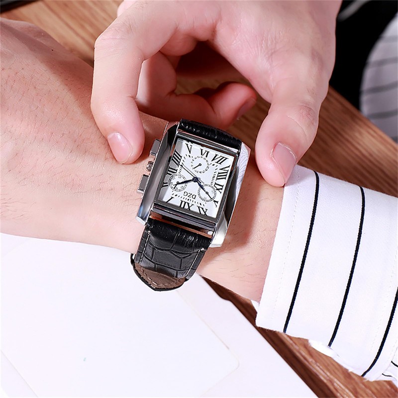 - Japanese quartz movement with analogue display, square alloy case, false dials.