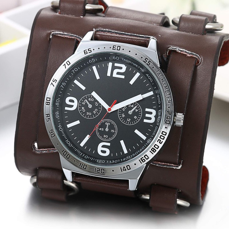 JewelryWe Mens Wide Cuff Watch Wide Genuine Leather Gothic Quartz Watch Black Brown Punk Style Wrist Watch