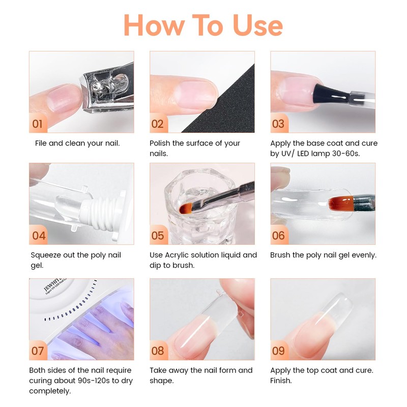 - High Quality & Long Lasting:The formula has been tested and adjusted many times. Poly gel is non-toxic, safe in ingredients, easy to dry, and has good toughness. It can be kept for a month or even longer after manicure on the fingers.