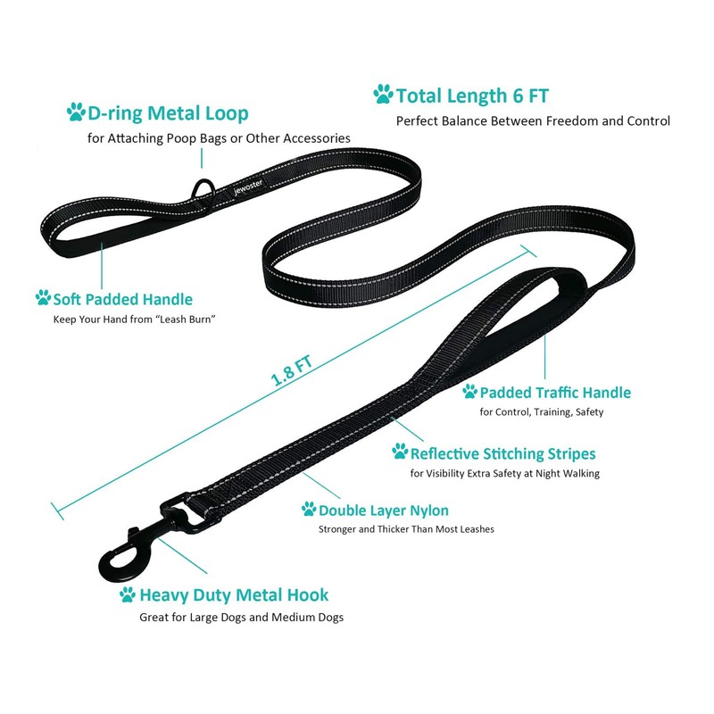 JEWOSTER Heavy Duty Dog Leash - 2 Handles by Padded Traffic Handle for Extra Control, 6foot Long - Perfect for Medium to Large Dogs (6 ft, Black)