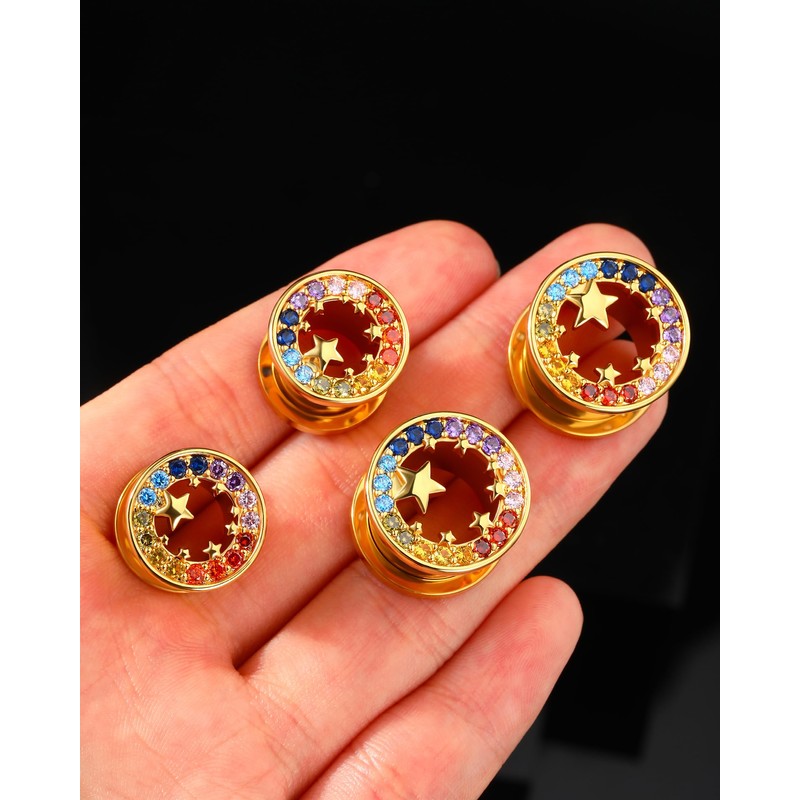 Jewseen Surgical Steel Ear Gauges Plugs Rainbow Cubic Zircon Ear Tunnels Star Gauges for Ears Gold Ear Plugs for Women 2g-5/8’’