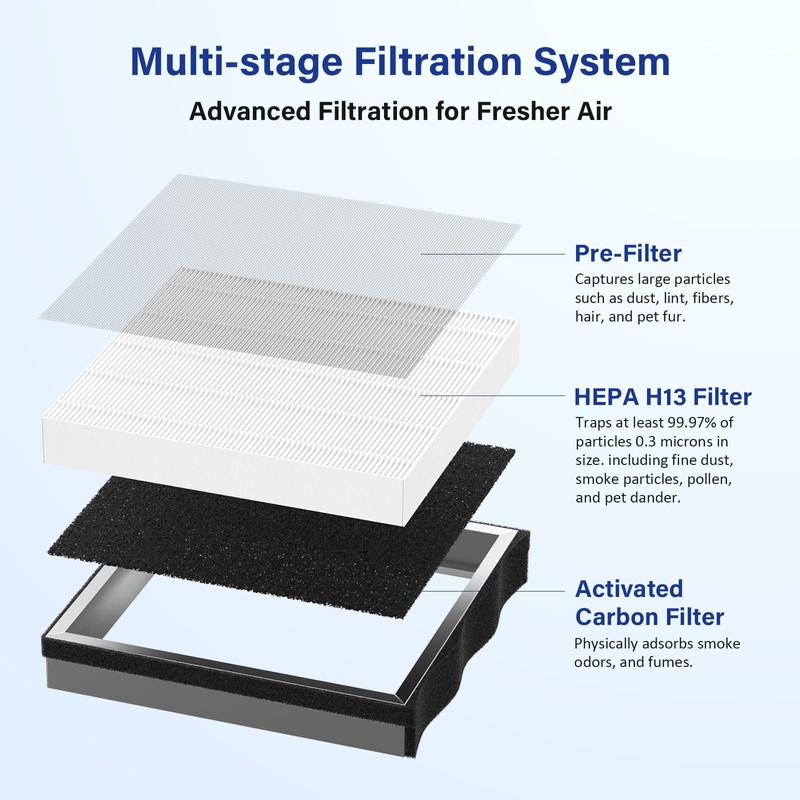 - 3-Stage Filtration: A pre-filter, H13 True HEPA filter, and activated carbon filter filters up to 99.97% of airborne particles including pet dander, smoke, odor, dust & more