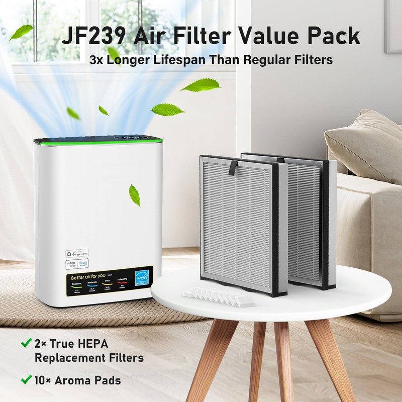 - Value Packages: The value pack includes 2 pack JF239 air purifier filter replacements and 10 Aroma Pads